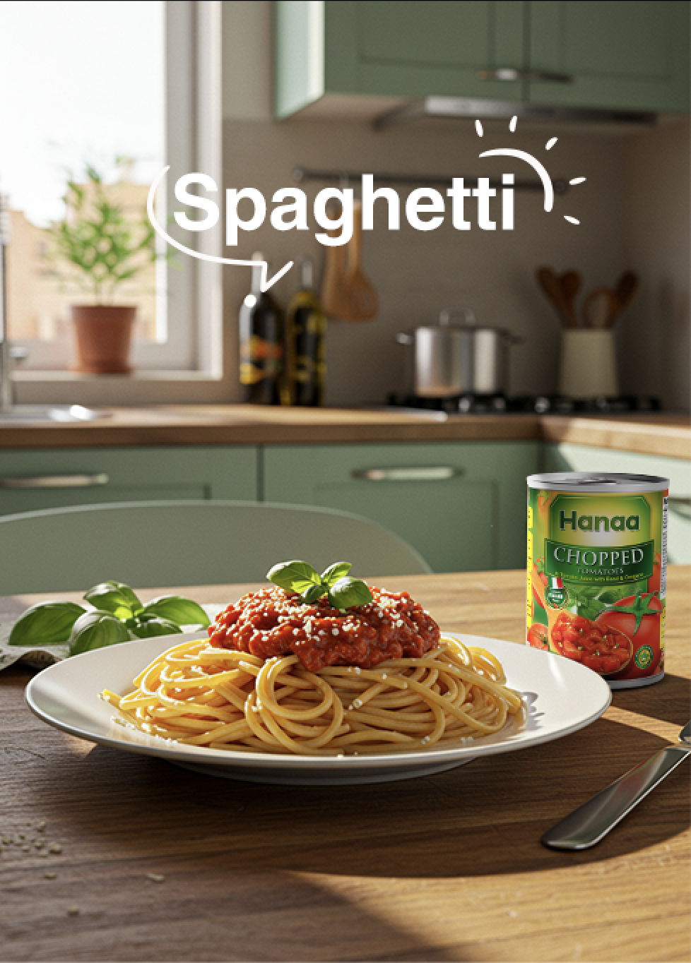 Cook spaghetti. In another pan, sauté garlic in olive oil. Add Hanaa Chopped Tomato, salt, and pepper. Simmer 10 minutes. Toss with spaghetti and top with parmesan and basil.
